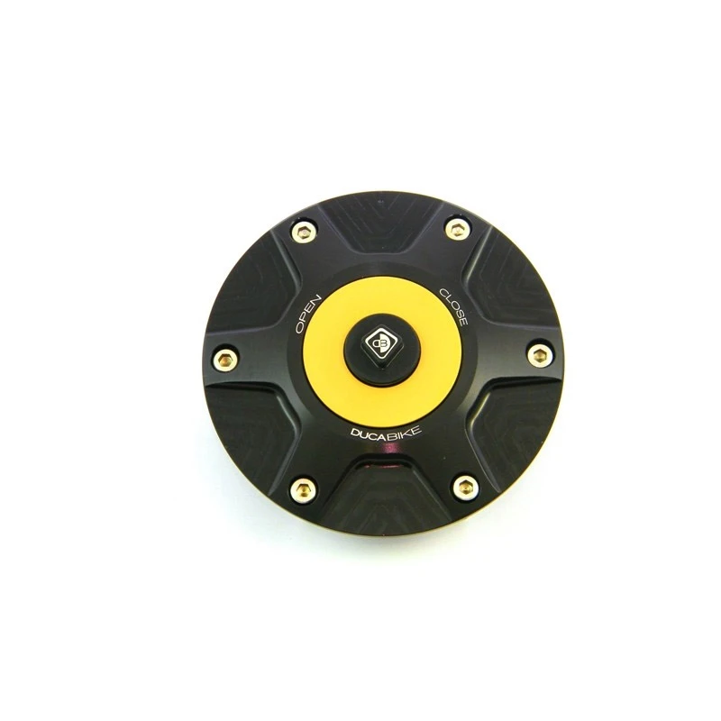 Tappo serbatoio benzina lavorato dal pieno in lega leggera, con successivo trattamento di anodizzazione superficiale colorata. Chiave in fibra di carbonio. In dotazione oring di tenuta.