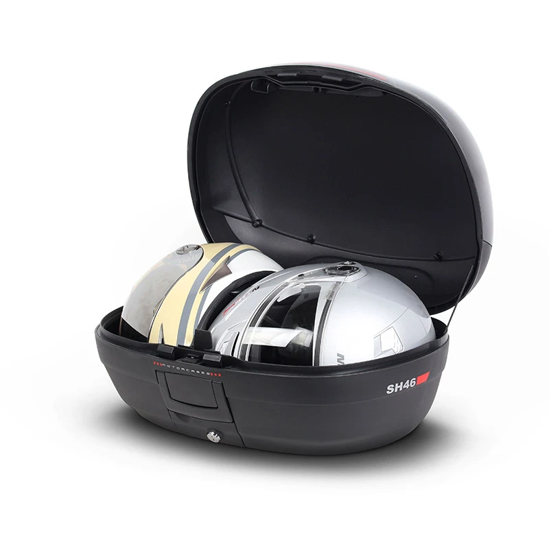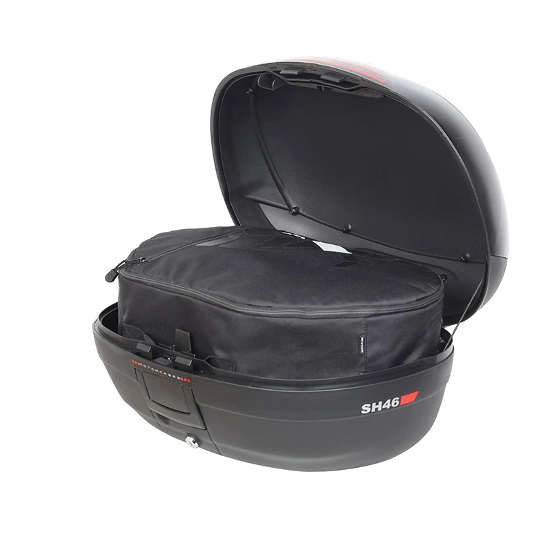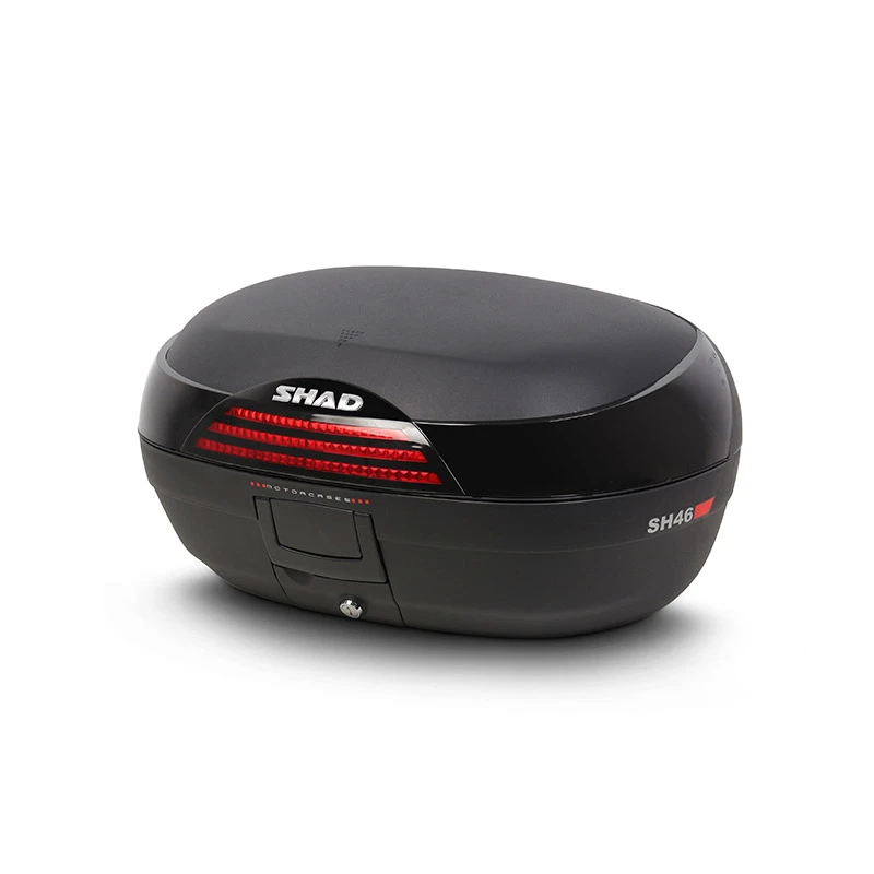 Bauletto molto capiente e robusto, adatto all’utilizzo urbano o a lunghe percorrenze in moto e in scooter. Può contenere fino a due caschi apribili. Dispone del sistema “Handle Lock System”, una serratura che permette contemporaneamente di chiudere il bauletto e di fissarlo alla moto. Dimensioni: 58 cm x 31 cm x 42 cm. Capacità: 46 litri. SH46 è un bauletto molto capiente e robusto. Realizzato in polipropilene rinforzato di alta qualità, protegge il carico dagli urti e dalle intemperie, essendo totalmente impermeabile. Il design è caratterizzato dalle forme arrotondate, da un catadiottro centrale nero verniciato con linee rosse, che conferiscono al bauletto un aspetto sportivo. Può contenere fino a due caschi apribili ed ha le dimensioni perfette sia per muoversi in città che per viaggi più lunghi, in moto o in scooter. Dispone del sistema “Handle Lock System”, una serratura che permette contemporaneamente di chiudere il bauletto e di fissarlo alla moto. Dispone inoltre di una pratica maniglia, che rende la rimozione ed il trasporto del bauletto particolarmente comodi. Internamente è equipaggiato con cinghie elastiche, per mantenere il carico in ordine. Come tutti i bauletti SHAD, può essere aperto e chiuso con una sola mano, senza l’utilizzo della chiave, necessaria soltanto quando vogliamo fissare il bauletto alla piastra sulla moto. Dispone di una pratica maniglia, che facilita il trasporto e l’ancoraggio del bauletto. Per coloro che desiderano aggiungere un tocco di stile, è disponibile in opzione la cover in varie colorazioni, oppure neutra, personalizzabile a proprio piacimento. L’SH46 dispone inoltre dei seguenti optionals: schienalino (D0RI60), perfettamente integrato con il bauletto e studiato per offrire maggiore comfort al passeggero borsa interna (X0IB00), con apertura superiore, tasca esterna di facile accesso, imbottitura protettiva e comoda maniglia kit luce freni (D0B40KL), realizzato con LED a basso consumo e studiato per aumentare la visibilità e la sicurezza. Il kit luce freni è anche particolarmente facile da montare, poiché si fissa direttamente alla parte inferiore della base del bauletto portapacchi in metallo da fissare al coperchio del bauletto (D0PS00). Come altri bauletti (ad eccezione di TR48/TR37) per moto SHAD, include la griglia e il kit fissaggio.