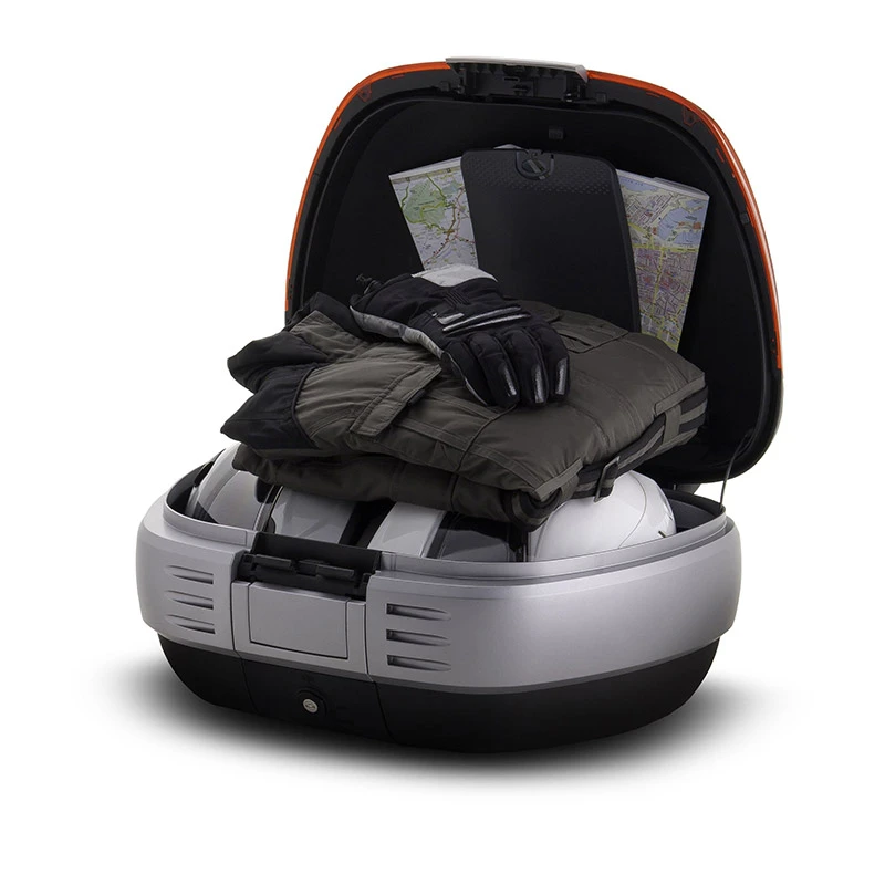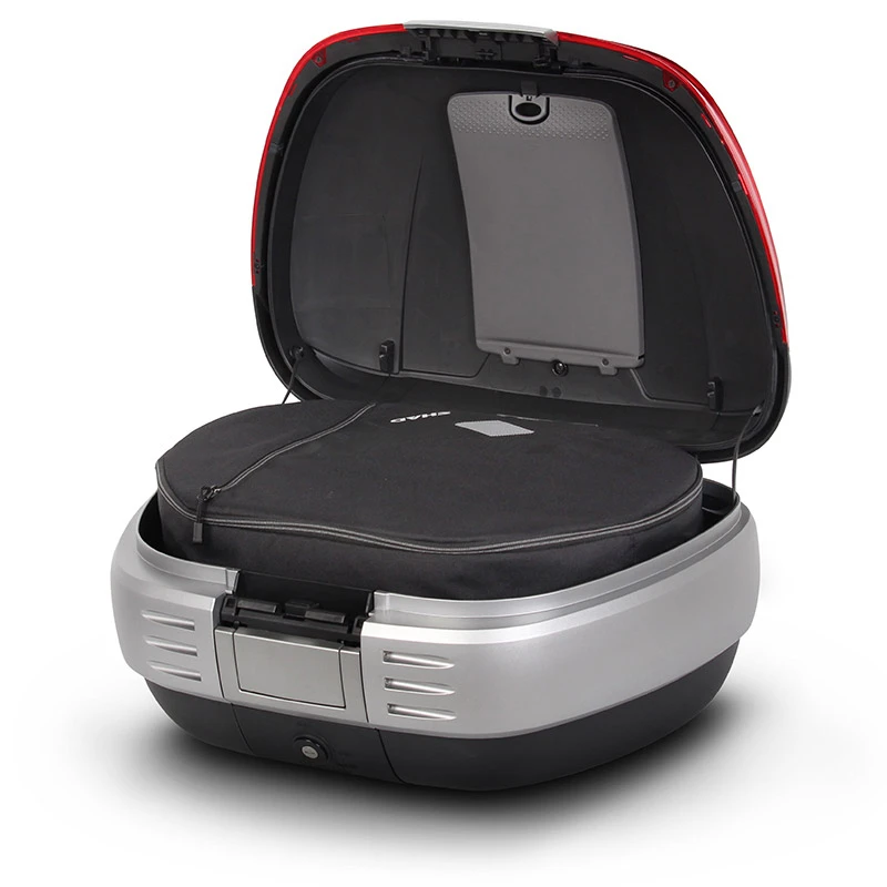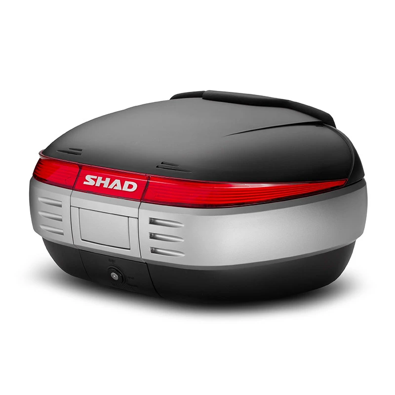 Bauletto per moto robusto ed elegante, con capacità di 50 litri (2 caschi modulari). Sistema di apertura e chiusura “Smart Lock System”. Schienalino e tasca portadocumenti interna inclusi. Cover disponibili in diversi colori come optional. Ideale per chi ama i lunghi viaggi in moto. SH50 è un bauletto robusto ed elegante, ideale per chi ama i lunghi viaggi in moto. La capacità di 50 litri consente di trasportare 2 caschi modulari e vari altri accessori. Il bauletto include di serie lo schienalino (cuscino passeggero) ed un pratico porta documenti, fissato all’interno del coperchio. Internamente è equipaggiato con cinghie elastiche, per mantenere il carico in ordine. Dispone dell’innovativo e pratico sistema di chiusura ermetica “Smart Lock System”, un sistema con maniglia retrattile automatica e chiusura ermetica in 3 posizioni. Il sistema Smart Lock consente di aprire e chiudere il bauletto con una sola mano, senza necessariamente utilizzare ogni volta la chiave, che potrà essere utilizzata nel caso si voglia bloccare la serratura o rimuovere il bauletto dalla moto. Per coloro che desiderano aggiungere un tocco di stile, è disponibile in opzione la cover in varie colorazioni, oppure neutra, personalizzabile a proprio piacimento. Il bauletto SH50 dispone di numerosi optionals: borsa interna (X0IB00), con apertura superiore, tasca esterna di facile accesso, imbottitura protettiva e comoda maniglia kit luce freni (D0B29KL), realizzato con LED a basso consumo e studiato per aumentare la visibilità e la sicurezza. Il kit luce freni è anche particolarmente facile da montare, poiché si fissa direttamente alla parte inferiore della base del bauletto portapacchi in metallo da fissare al coperchio del bauletto (D0PS00). Come altri bauletti (ad eccezione di TR48/TR37) per moto SHAD, include la griglia e il kit fissaggio. Dimensioni: 60 cm x 32 cm x 46 cm. Capacità: 50 litri.
