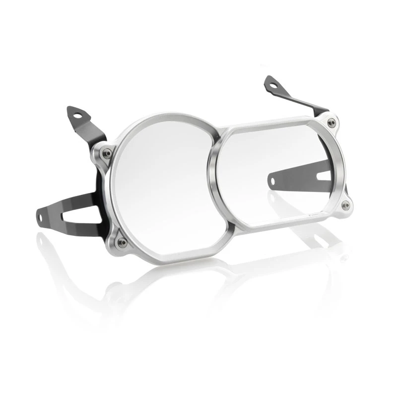 Rizoma ha ideato la Protezione faro anteriore, ricercando il giusto equilibrio tra praticità, grazie al sistema di aggancio/sgancio rapido, estetica e funzionalità. La protezione dona un adeguato riparo al gruppo ottico della GS, cornice interamente ricavata dal pieno e PLEXIGLASS® protettivo di alta qualità.