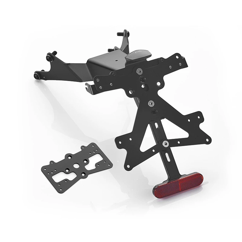 Realizzato in alluminio, ogni kit Porta targa Fox è studiato ad hoc per lo specifico modello di moto a cui è dedicato. Questo non solo fa sì che si plasmi perfettamente alla linea della moto, ma lo rende facile e di Veloce installazione. Infatti, ogni kit viene fornito completo di tutto il necessario per un montaggio che non richieda modifiche a parti OEM. Grande funzionalità in dimensioni ridotte al minimo, sempre nel rispetto di quanto previsto dagli standard legislativi. I Kit Fox sono dotati di luce targa LED SMD, catarifrangente, supporti indicatori di direzione Rizoma, sono regolabili e forniti con fermo di sicurezza, per assicurare la corretta inclinazione.
