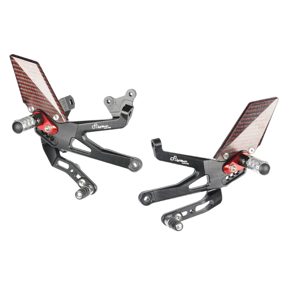 Per tutti i modelli di pedane Track-System, LighTech è lieta di presentarvi la versione “R”! Questa versione speciale è il top in fatto di pedane regolabili: – paratacchi in carbonio a trama rossa con logo “R” rosso – poggiapiedi e puntalini pieghevoli – cuscinetti SKF ad alta scorrevolezza – viteria principale in titanio grado-5 – supporti poggiapiede di colore rosso Tutto questo per ottenere il massimo feeling del pilota col proprio mezzo e la massima precisione durante gli spostamenti sulla sella ed i rapidi cambi marcia e per offrire non solo elevati contenuti tecnici ma anche un look assolutamente unico e molto ricercato, in grado di caratterizzare l’estetica della moto rendendola molto più attraente. LighTech fornisce tutti ricambi per un eventuale ripristino delle pedane in caso di caduta o di smarrimento di qualche componente.