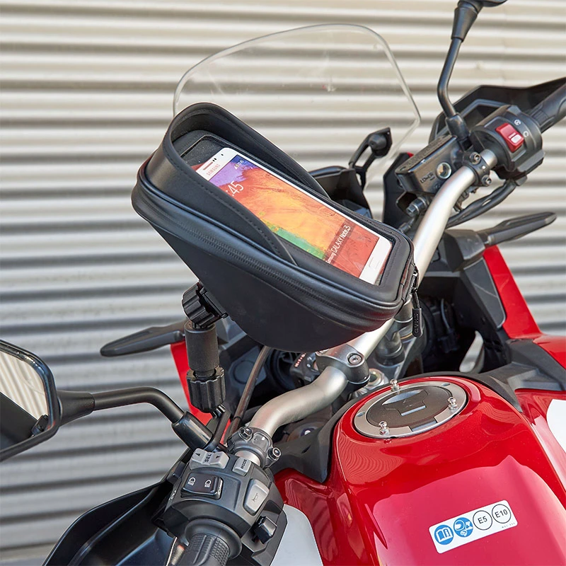 Porta smartphone con tasca extra, adatto a tutte le moto. Permette di portare il portafoglio, gli occhiali o le chiavi in modo ordinato. Il supporto può essere fissato facilmente e rapidamente allo specchietto retrovisore o manubrio, grazie al suo attacco universale, regolabile anche quando si indossano i guanti. Visiera antiriflesso, passacavo rinforzato e cunei interni per il corretto montaggio del telefono cellulare. Include una cinghia di sicurezza. La versione Mirror offre come accessorio opzionale due estensori M8 e M10 (X1SGMAR).