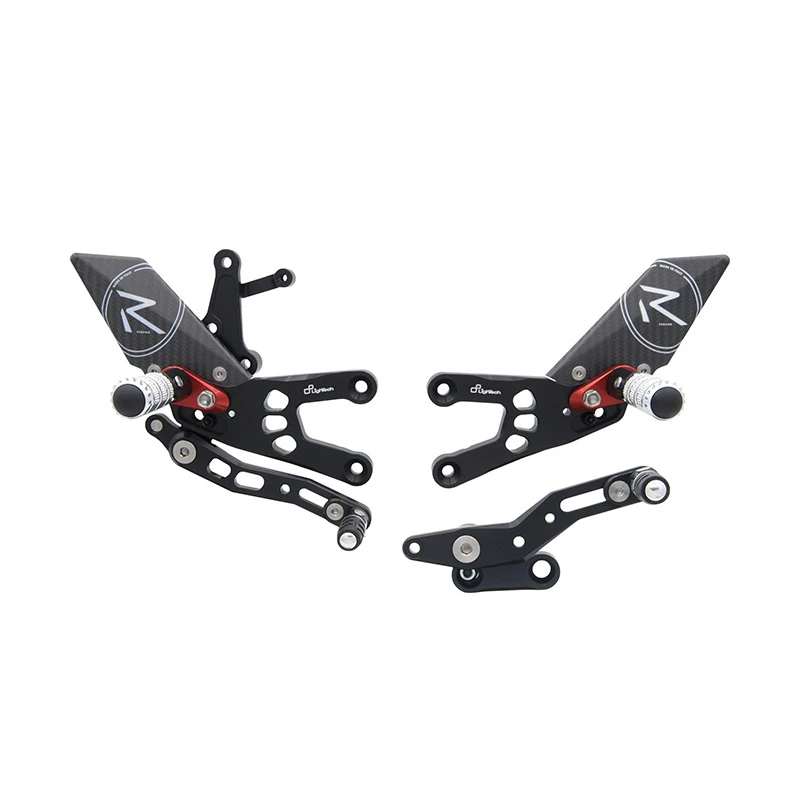 Pedane Regolabili Versione “R” Con Poggiapiede Pighevole Silver, Puntalino Di Comando Pieghevole, Paratacco In Carbonio “White R”, Supporto Poggiapiede Anodizzato Rosso, Cuscinetti Ad Alto Scorrimento E Bulloneria In Titanio.