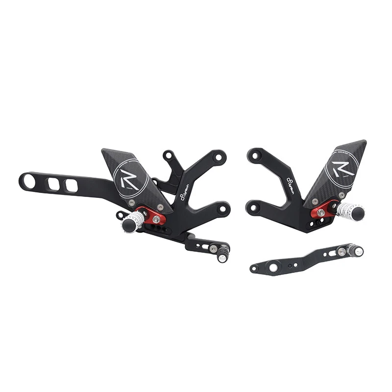 Pedane Regolabili Versione “R” Con Poggiapiede Pighevole Silver, Puntalino Di Comando Pieghevole, Paratacco In Carbonio “White R”, Supporto Poggiapiede Anodizzato Rosso, Cuscinetti Ad Alto Scorrimento E Bulloneria In Titanio.