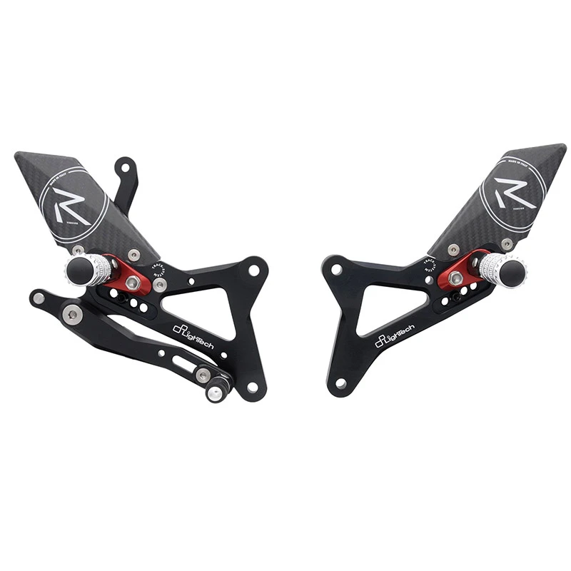 Per tutti i modelli di pedane Track-System, LighTech è lieta di presentarvi la versione “R”! Questa versione speciale è il top in fatto di pedane regolabili: – paratacchi in carbonio a trama rossa con logo “R” rosso – poggiapiedi e puntalini pieghevoli – cuscinetti SKF ad alta scorrevolezza – viteria principale in titanio grado-5 – supporti poggiapiede di colore rosso Tutto questo per ottenere il massimo feeling del pilota col proprio mezzo e la massima precisione durante gli spostamenti sulla sella ed i rapidi cambi marcia e per offrire non solo elevati contenuti tecnici ma anche un look assolutamente unico e molto ricercato, in grado di caratterizzare l’estetica della moto rendendola molto più attraente. LighTech fornisce tutti ricambi per un eventuale ripristino delle pedane in caso di caduta o di smarrimento di qualche componente.