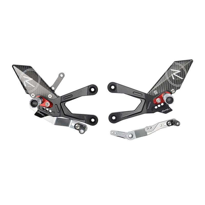 Pedane Regolabili Versione “R” Con Poggiapiede Pighevole Silver, Puntalino Di Comando Pieghevole, Paratacco In Carbonio “White R”, Supporto Poggiapiede Anodizzato Rosso, Cuscinetti Ad Alto Scorrimento E Bulloneria In Titanio.