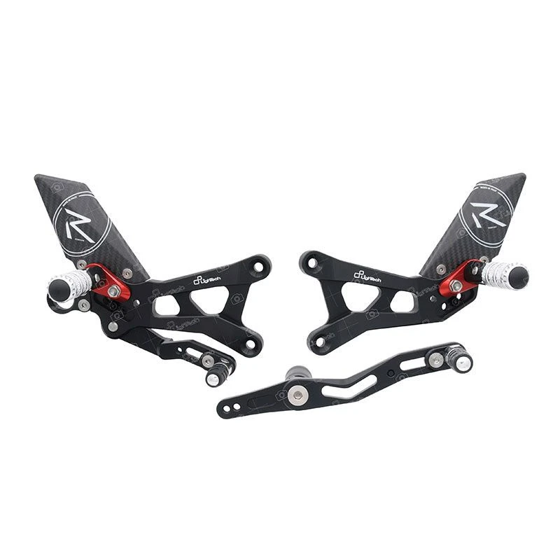 Pedane Regolabili Versione “R” Con Poggiapiede Pighevole Silver, Puntalino Di Comando Pieghevole, Paratacco In Carbonio “White R”, Supporto Poggiapiede Anodizzato Rosso, Cuscinetti Ad Alto Scorrimento E Bulloneria In Titanio.