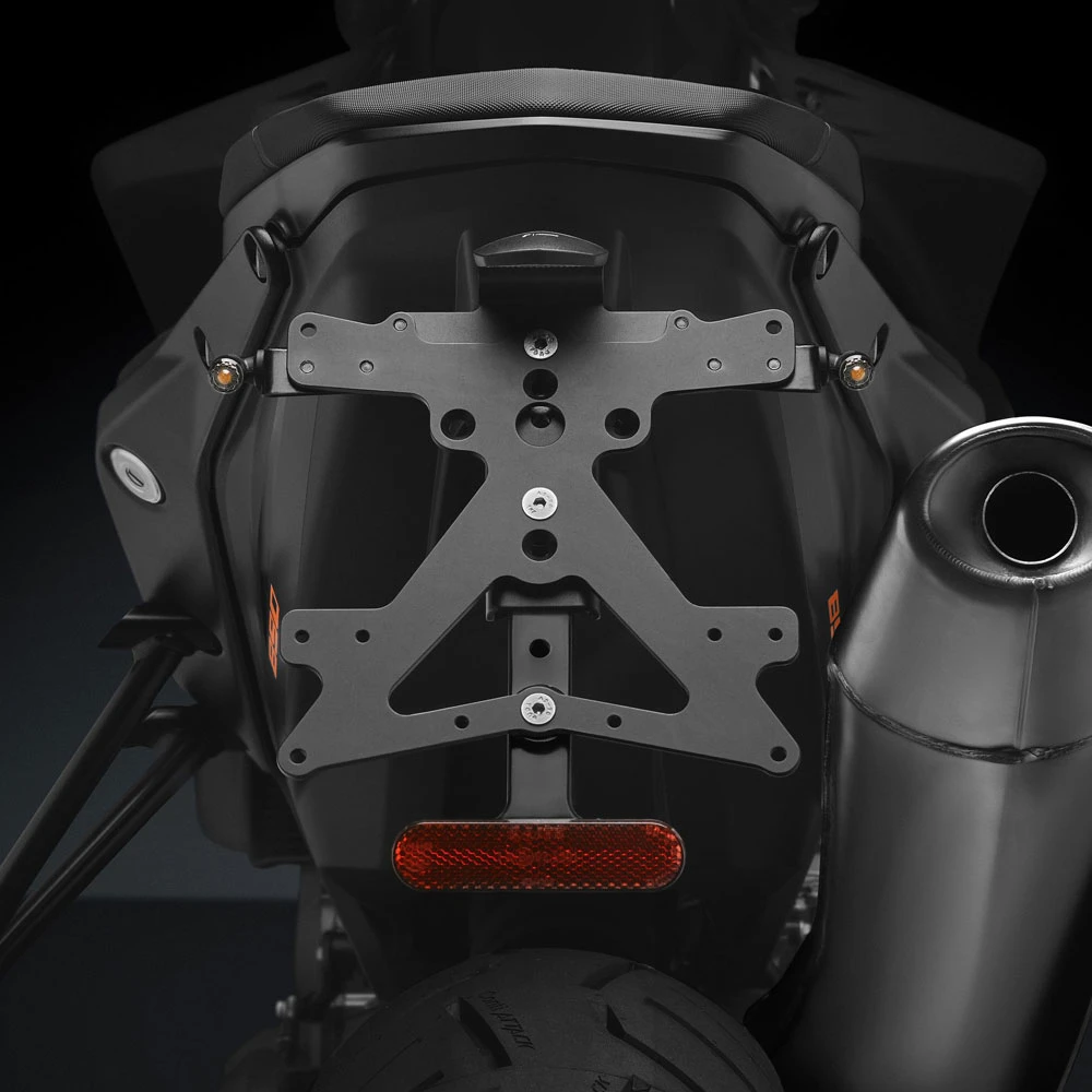 Kit completo di piatto targa 173×173 mm, piatto targa USA 166×89,5 mm, supporti per indicatori di direzione Rizoma, luce targa LED SMD (omologata) e catarifrangente. Supporti per indicatori di direzione OEM non inclusi.