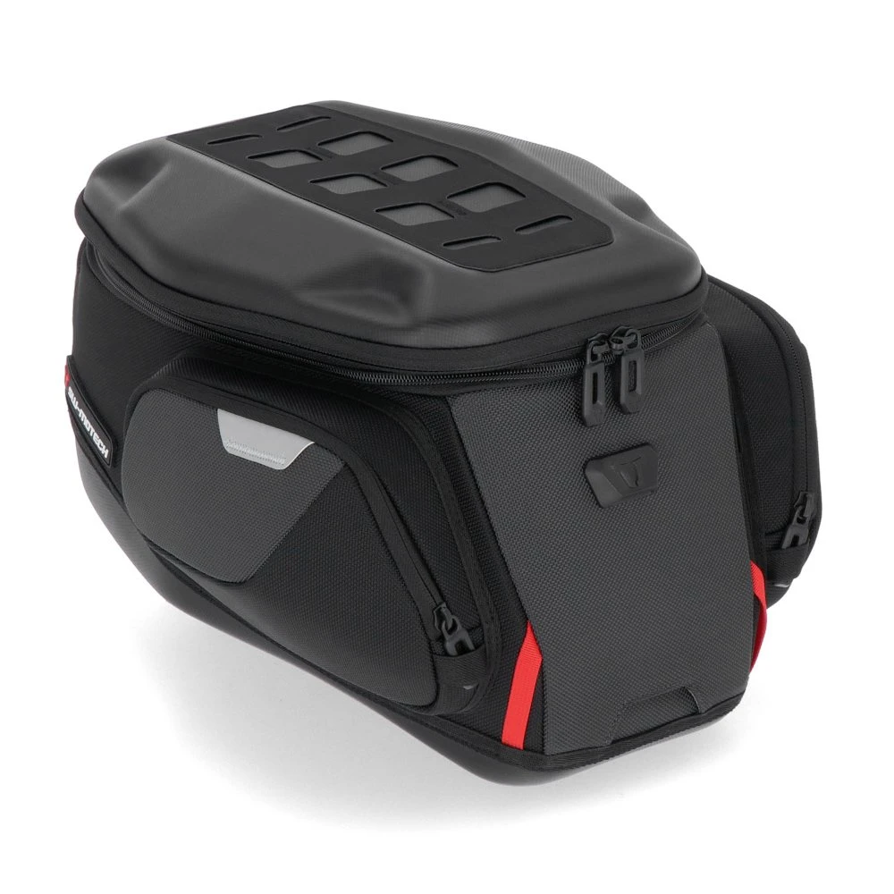 PRO Trial è il compagno ideale per lunghe escursioni. La borsa serbatoio ha 18 litri di spazio di magazzinaggio con espansione aperta del volume ed è particolarmente adatta per l’uso su serbatoi leggermente bombati. Le due tasche esterne offrono uno spazio di magazzinaggio supplementare. Le borse serbatoio PRO offrono un design elegante e intramontabile combinato con materiali resistenti e proprietà del prodotto accuratamente studiate: il nylon balistico protegge il bagaglio da urti, vento e agenti atmosferici. La parte superiore in materiale EVA laminato conferisce alle borse una forma distintiva e, in abbinamento con un attacco MOLLE, garantisce un sostegno sicuro per supporti per smartphone e tablet. La guida di scorrimento premontata di fabbrica dell’anello superiore consente di adattare più facilmente la borsa serbatoio alla forma del serbatoio e alle esigenze ergonomiche del conducente. Solo le borse serbatoio PRO sono in grado di offrire questa flessibilità. A tale scopo SW-MOTECH offre gli anelli serbatoio PRO brevettati in plastica rinforzata con fibra di vetro. Sono realizzati per essere abbinati al modello di motocicletta. Il robusto anello serbatoio PRO con guida magnetica fissa le borse serbatoio PRO con una chiusura a scatto meccanica QUICK-LOCK. Quindi le borse serbatoio possono essere agganciate o rimosse con un solo gesto.