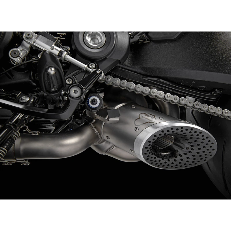 Gruppo di scarico completo, sviluppato in collaborazione con Termignoni, per esaltare le già elevate doti di coppia e potenza del Diavel 1260. Realizzato in acciaio, sinonimo di robustezza, con fondelli in lega di alluminio ricavati dal pieno e il classico taglio a fetta di salame, accentua l’estetica della muscle-cruiser per eccellenza. Installando il gruppo completo di scarico si ottiene un miglioramento sia di coppia che di potenza su tutto l’arco di utilizzo del motore così da migliorare ulteriormente le performance della moto. L’estetica del Diavel si trasforma con il montaggio del gruppo di scarico grazie alle uscite su entrambi i lati ed al fondello di scarico in alluminio sapientemente lavorato.