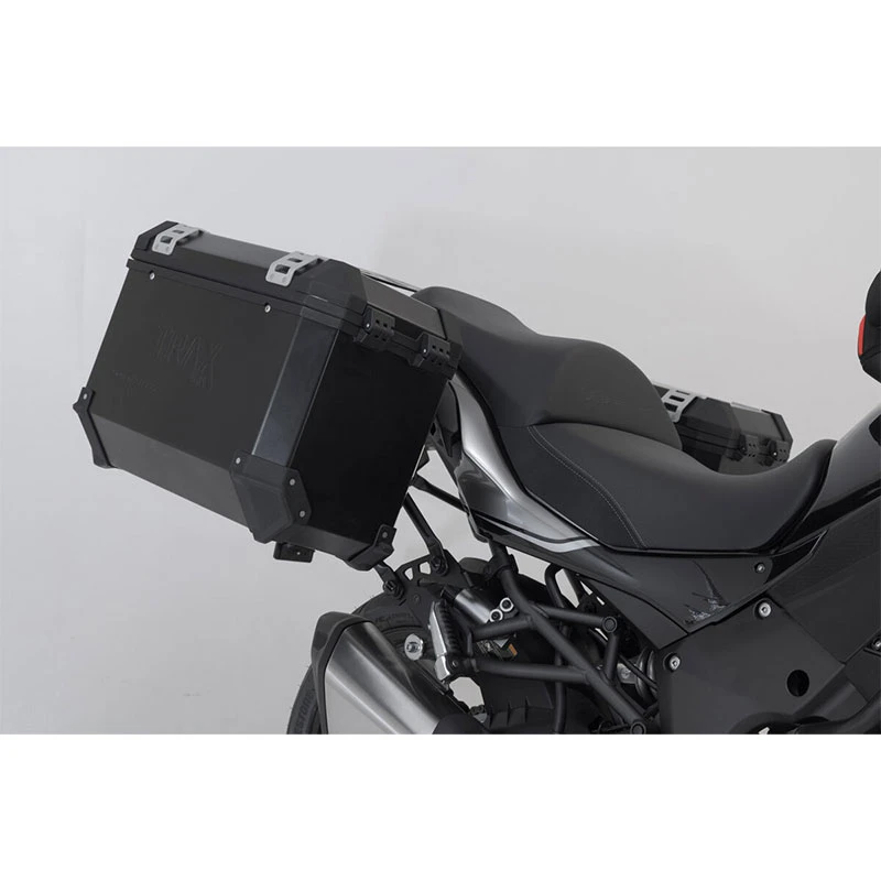 Le robuste valigie in alluminio TRAX ADV sono adatte a qualsiasi distanza: il design supporta la stabilità del robusto acciaio della parete in alluminio saldato da 1,5 mm. Il coperchio completamente removibile completo di manici in allumino anodizzato e chiusure rapide facilita il carico e lo scarico della valigia da moto, mentre i bordi a taglio obliquo garantiscono un’elevata libertà al corpo nella guida in curva. Con questa soluzione completa disporri di tutti i componenti necessari per affrontare lunghi viaggi con TRAX: due valigie laterali TRAX ADV, due telai portaborse SW MOTECH removibili, un kit adattatore, un kit serratura, un limitatore di apertura e un antifurto a un prezzo affascinante.