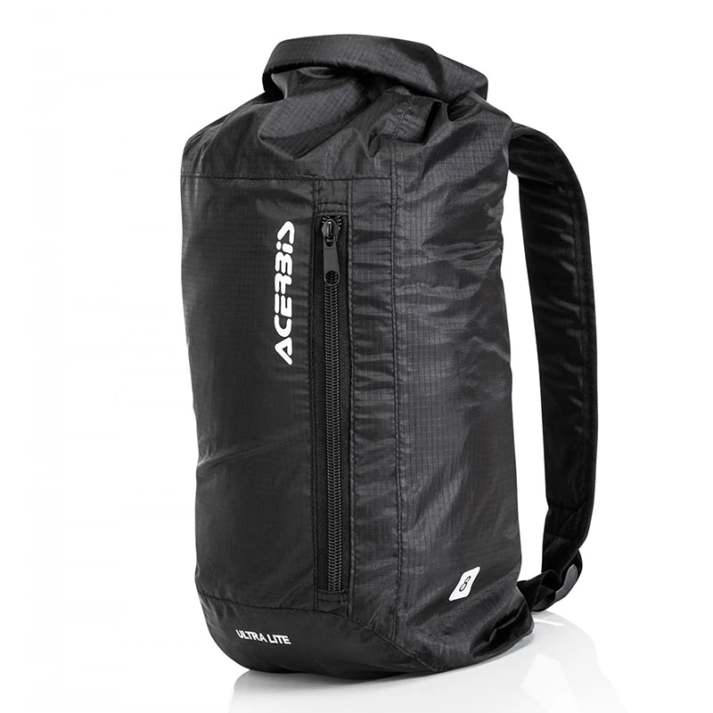 Capacità 8L. Waterproof. Facile trasporto in quanto packable. Chiusura superiore arrotolabile con fi ssaggio a ganci. Massima leggerezza. Tasca esterna con cerniera. Ideale per l’utilizzo sia in MTB che in moto.